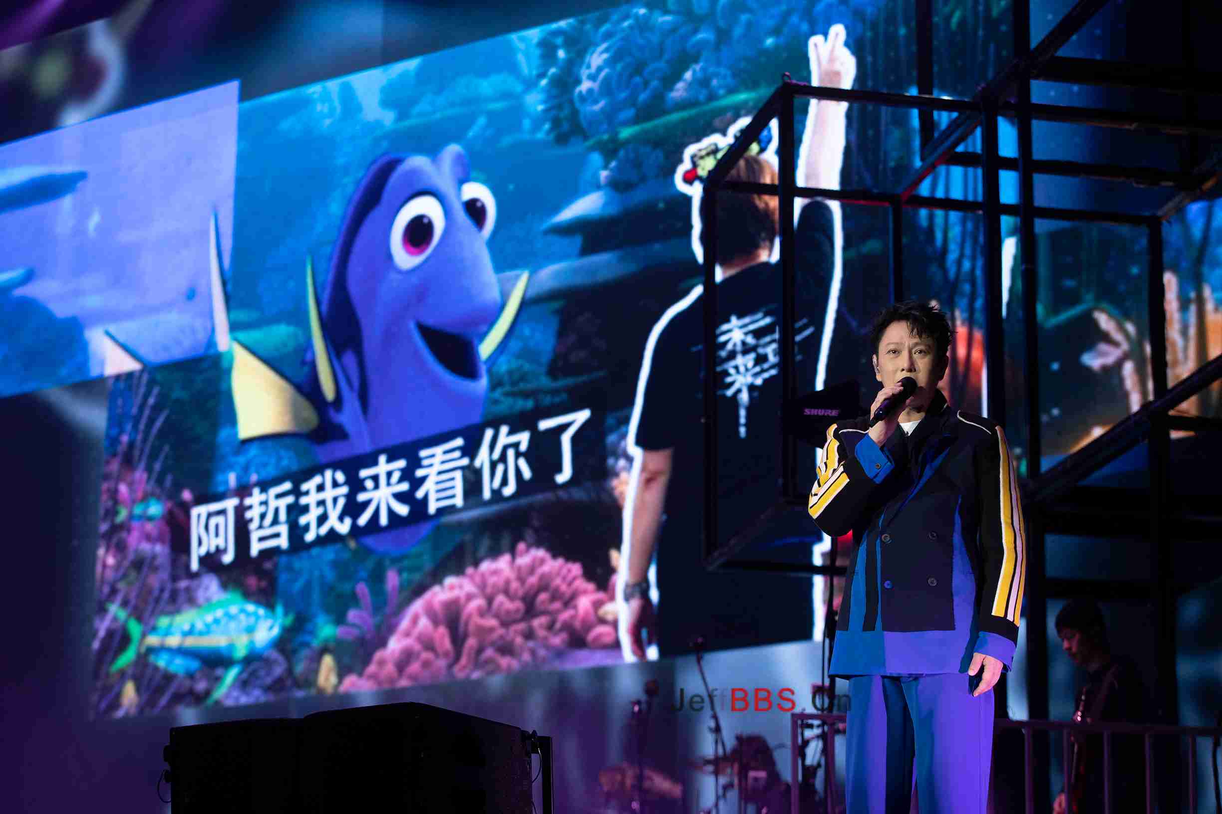 值得一提的是,歌曲《难以抗拒你容颜》设置了分享照片环节,歌迷常常带来一些有趣照片分享,这次有歌迷从阿哲的演出服装入手,分享了一张自己和《海底总动员》多莉的一张“合影”,调侃阿哲在演唱会上“撞衫多莉”,引起全场欢笑。