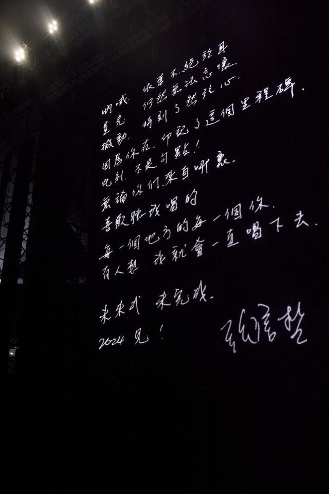 值得一提的是,演出最后,张信哲在舞台的大屏幕上分享了一段亲笔信。情真意切的亲笔书写,让观众们感受到张信哲对歌迷的感谢与重视,为现场歌迷提前送上一份带走独特浪漫与温情的“跨年礼物”。