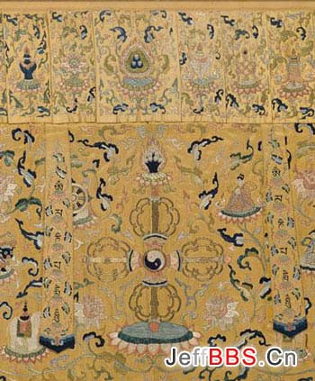 清(19世纪初)-明黄色缎绣八宝铃杵纹桌帷(局部)