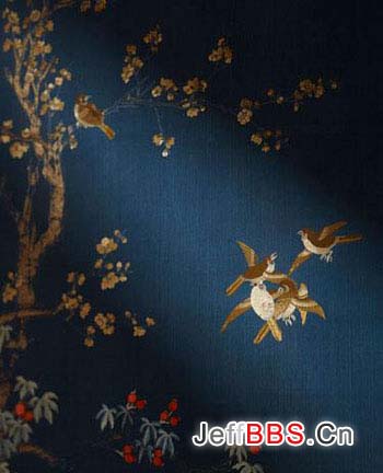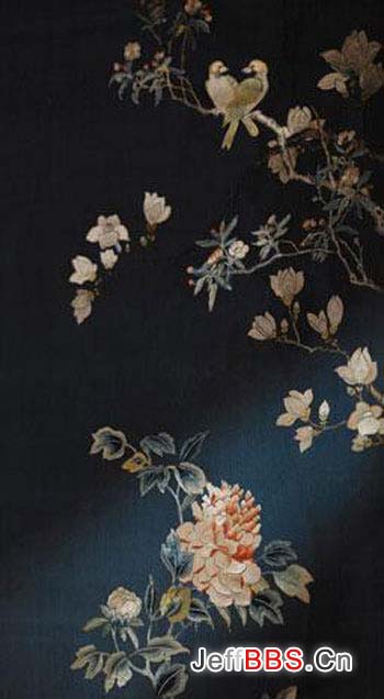 清同治-蓝色缎绣花鸟挂轴二件(局部1)
