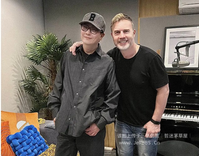 张信哲与老友「接招」(Take That)的盖瑞巴洛重逢。(图/潮水音乐提供)