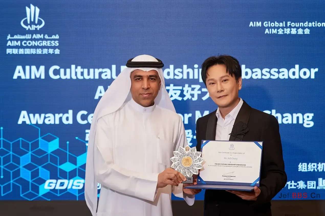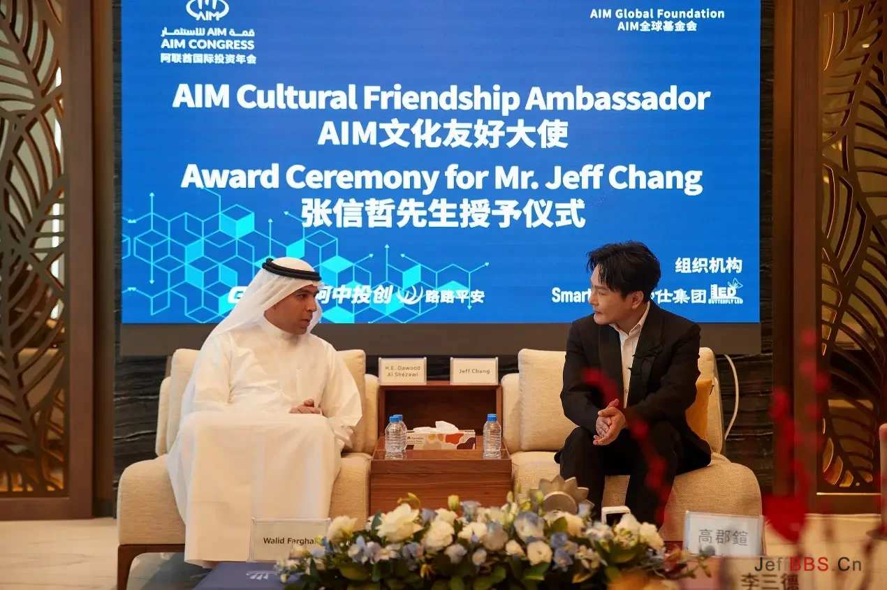春节假期后的第一天,“情歌王子”张信哲与AIM全球基金会大会主席达伍德(Dawood Al Shezawi)阁下相约迪拜,进行了一场面对面交流。当天,张信哲受到主席热烈欢迎,并被授予“AIM文化友好大使”的荣誉称号。这一荣誉不仅是对张信哲音乐成就的认可,更是对他多年致力于推动国际文化交流的努力的肯定。双方相谈甚欢,大会主席授予张信哲“AIM文化友好大使”证书和徽章。